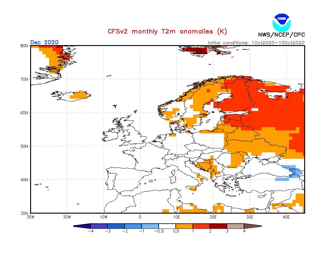 Anomalies de températures par rapport aux normales de saison sur l'Ouest de l'Europe durant le mois de Décembre 2020 - Modèle Américain CFS