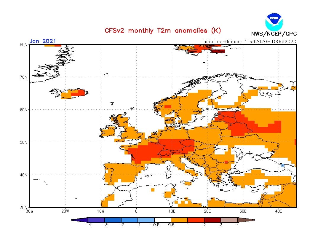 Anomalies de températures par rapport aux normales de saison sur l'Ouest de l'Europe durant le mois de Janvier 2021 - Modèle Américain CFS