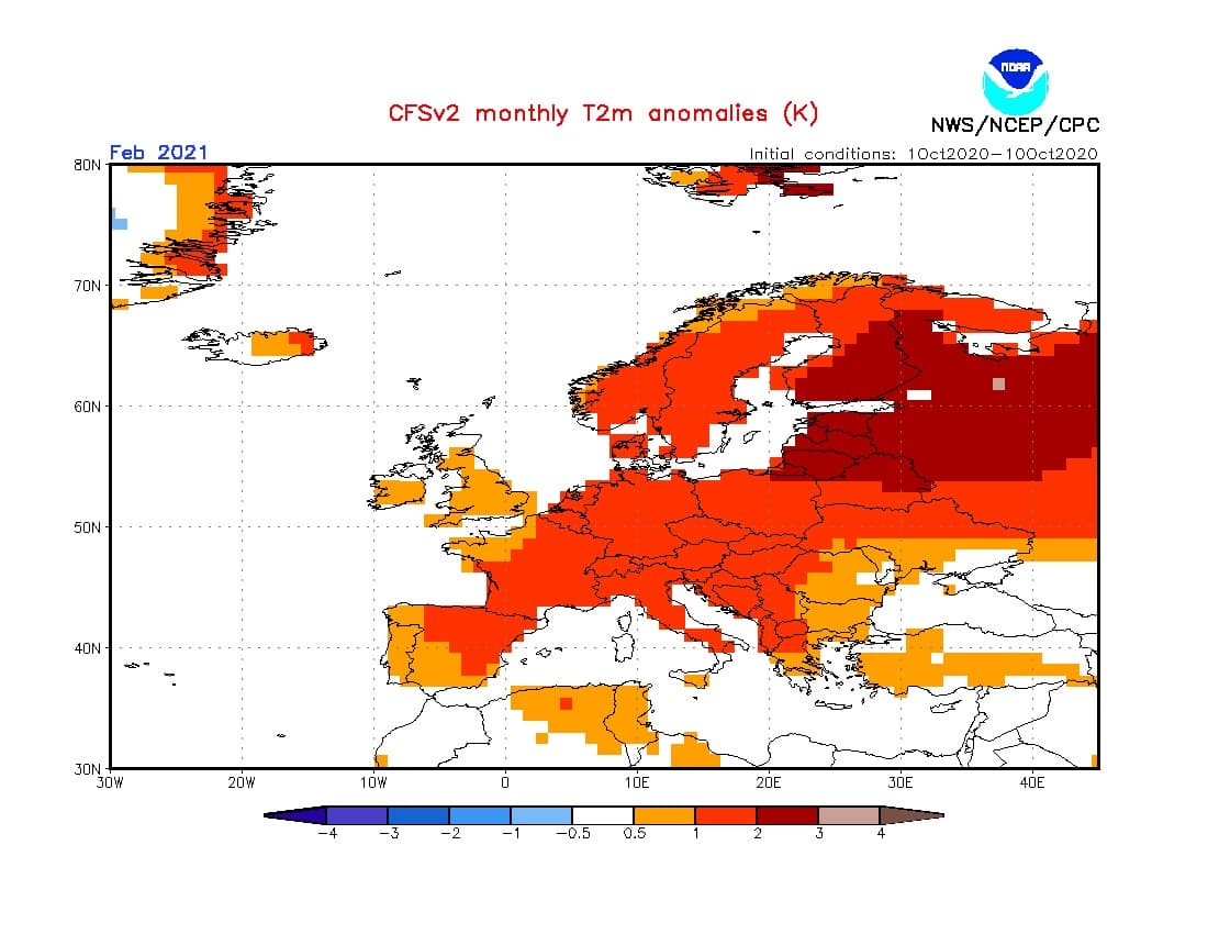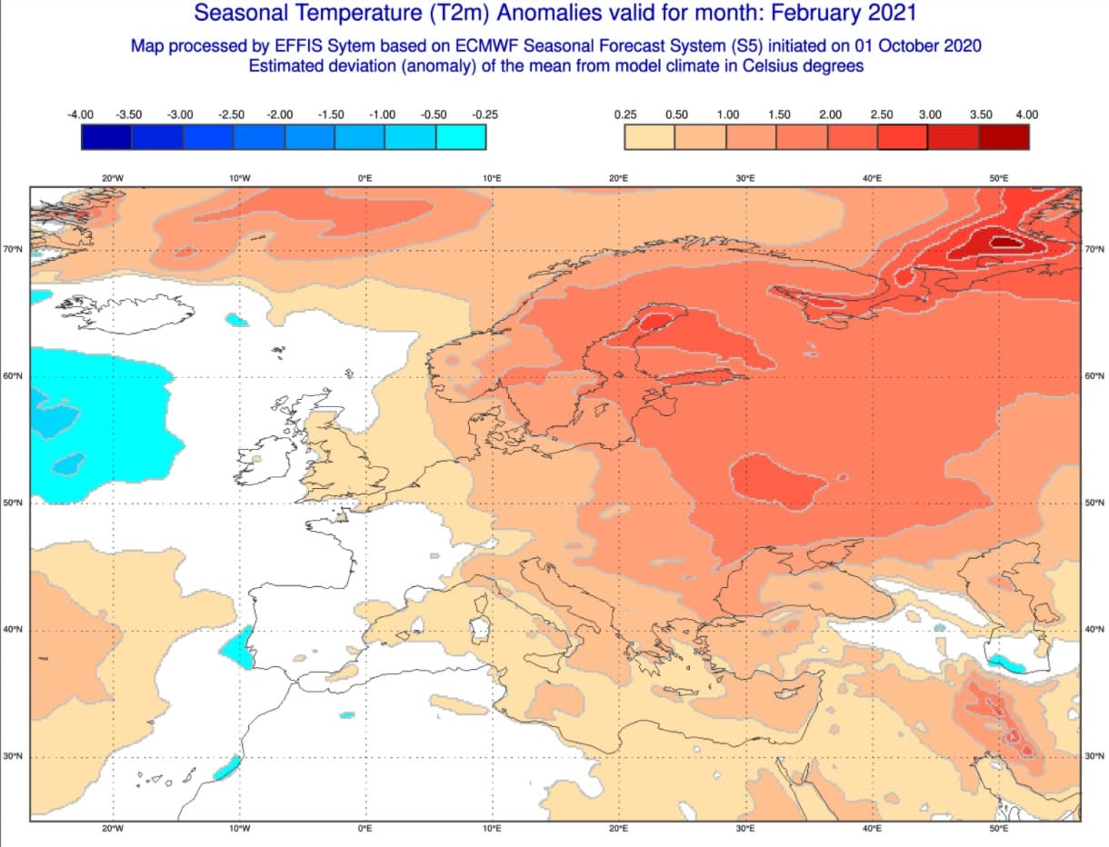 Anomalies de températures par rapport aux normales de saison sur l'Ouest de l'Europe durant le mois de Février 2021 - Modèle Européen ECMWF