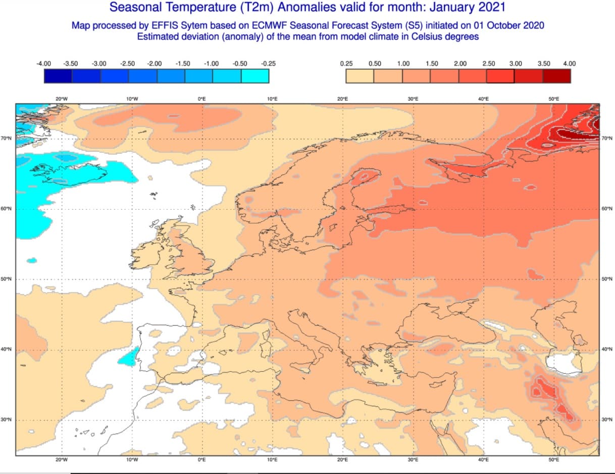 Anomalies de températures par rapport aux normales de saison sur l'Ouest de l'Europe durant le mois de Janvier 2021 - Modèle Européen ECMWF
