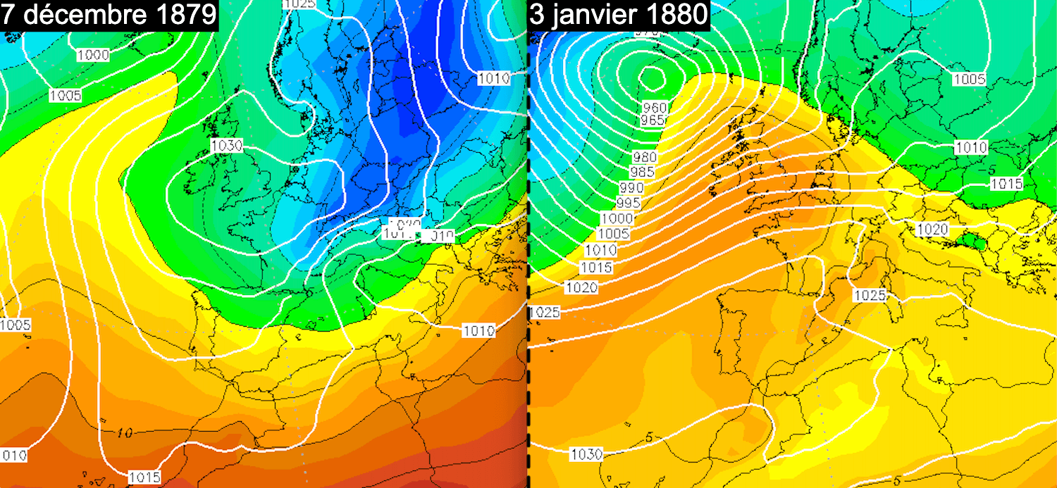 Masses d'air les 7 décembre 1879 et 3 janvier 1880 - réanalyse via wetterzentrale.de