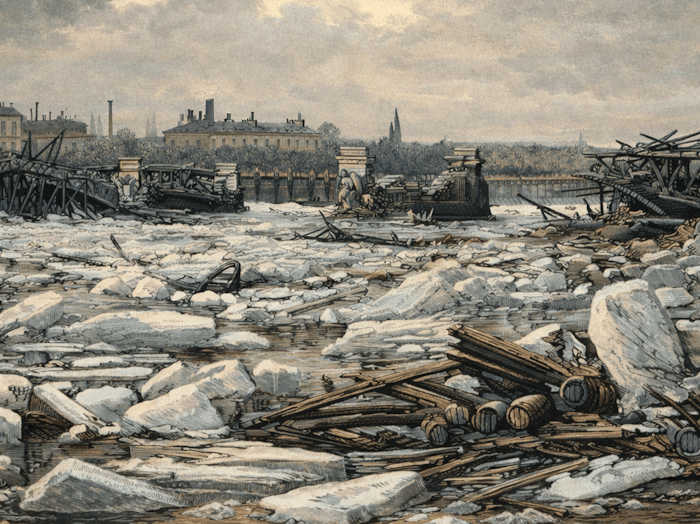Après un mois de décembre 1879 glacial, les grands fleuves français sont figés dans la glace. Un redoux spectaculaire survient début 1880. La débâcle rapide provoque des dégâts considérables et fait s'effondrer des ponts.