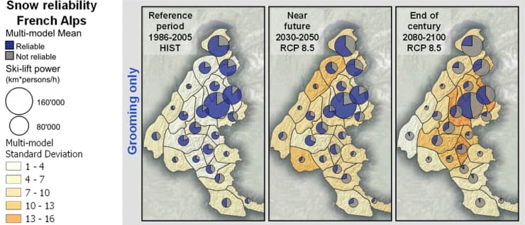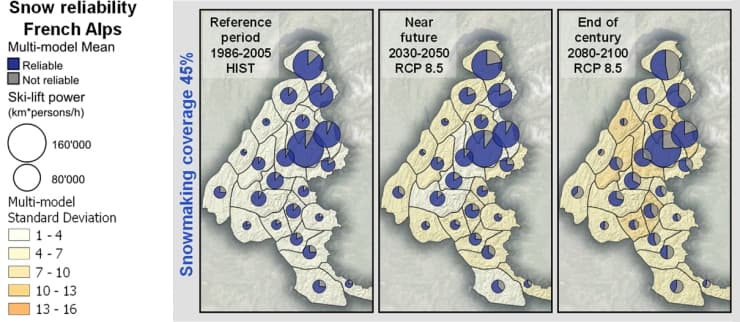 En revanche, la situation deviendrait très compliquée pour les massifs de moyenne montagne où la baisse de l'enneigement ne pourrait plus être compensée par les canons à neige, à cause de températures régulièrement trop douces. Plus de la moitié de certains domaines seraient alors impraticables. D'une manière générale, les effets néfastes seraient observés sur tous les massifs, se montrant encore plus importants sur tout le sud des Alpes ainsi que sur des massifs comme le Vercors, la Chartreuse ou encore les Bauges.