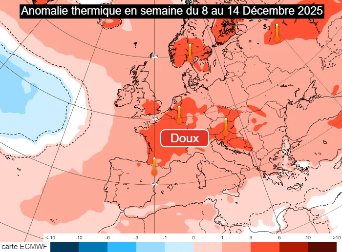Anomalie thermique modélisée en semaine du lundi 8 au dimanche 14 décembre 2025 - ECMWF