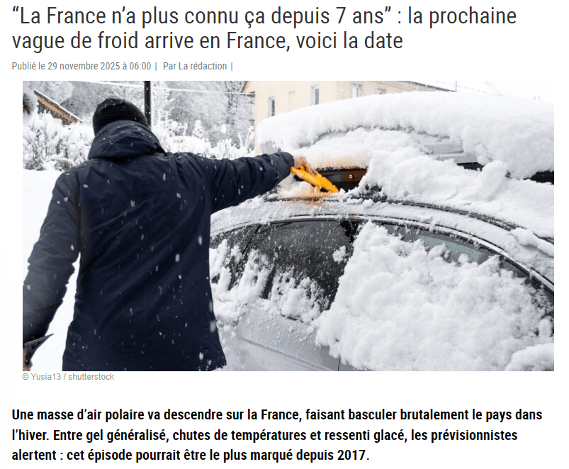 "La France n'a plus connu ça depuis 7 ans"... Voici comment une vague de froid est annoncée sur la France pour les jours à venir. Depuis ce week-end, cet article diffusé sur plusieurs sites (au trafic souvent modeste) commence à faire du bruit car il est partagé sur les réseaux sociaux. Et les superlatifs y ont la part belle ! On peut lire qu'une "masse d’air polaire va descendre sur la France, faisant basculer brutalement le pays dans l'hiver. Entre gel généralisé, chutes de températures et ressenti glacé, les prévisionnistes alertent : cet épisode pourrait être le plus marqué depuis 2017"...