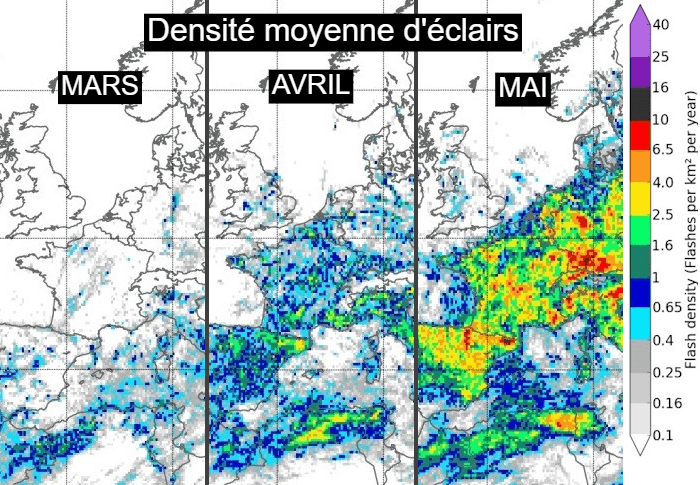 Densité moyenne d'éclairs au cours des mois de mars, avril et mai - Met-Office