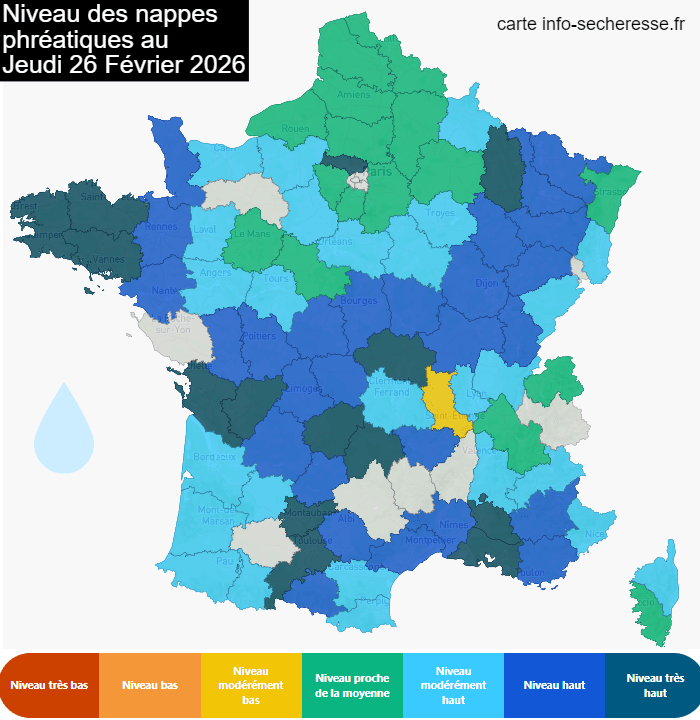 Niveau des nappes phréatiques ce jeudi 26 février 2026 - info-secheresse.fr