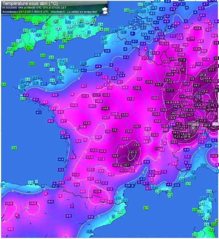 On mesure également jusqu'à -24,9°C à Morteau dans le Doubs, -27,8°C à Saugues en Haute-Loire à 940m d'altitude. Il s’agit souvent des valeurs les plus basses observées sur nos régions depuis l’hiver 1996-97.