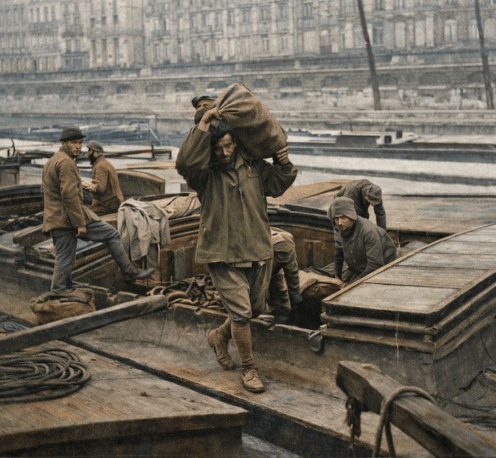 Déchargement par la main-d'œuvre après l'immobilisation par le gel - vague de froid 1917 - archives meteo-paris.com