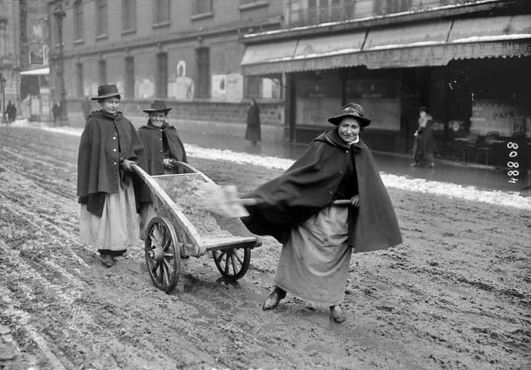 A Paris, le déneigement des voies de circulation est très compliqué en raison du manque de main-d’œuvre. Les femmes sont alors réquisitionnées.  Février 1917 - archives meteo-paris.com