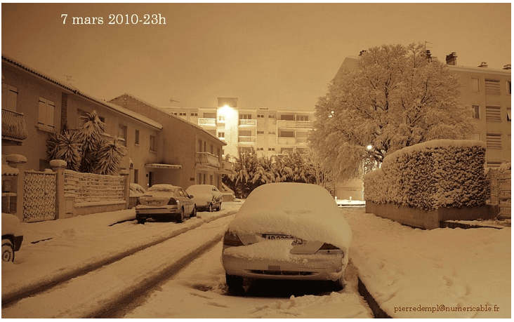 Plus de 30cm de neige à Nîmes au matin du 8 mars 2010 – Via infoclimat.fr
