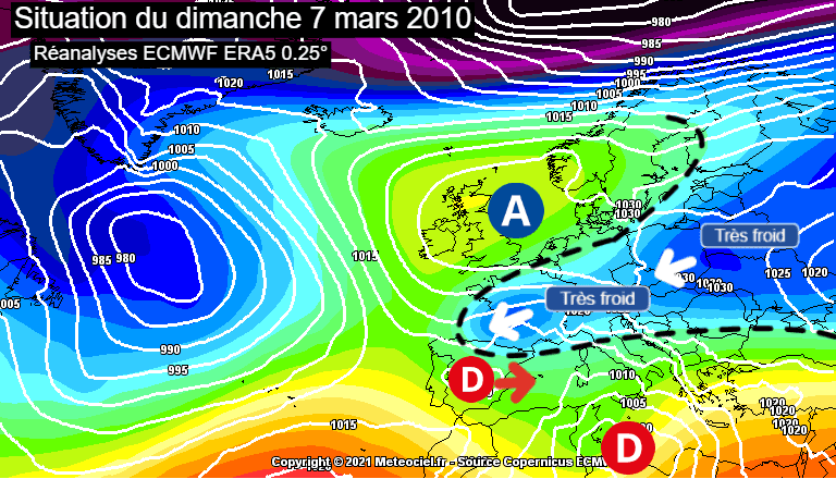 Réanalyse de la situation météorologique du dimanche 7 mars 2010 - archives ECMWF via meteociel.fr