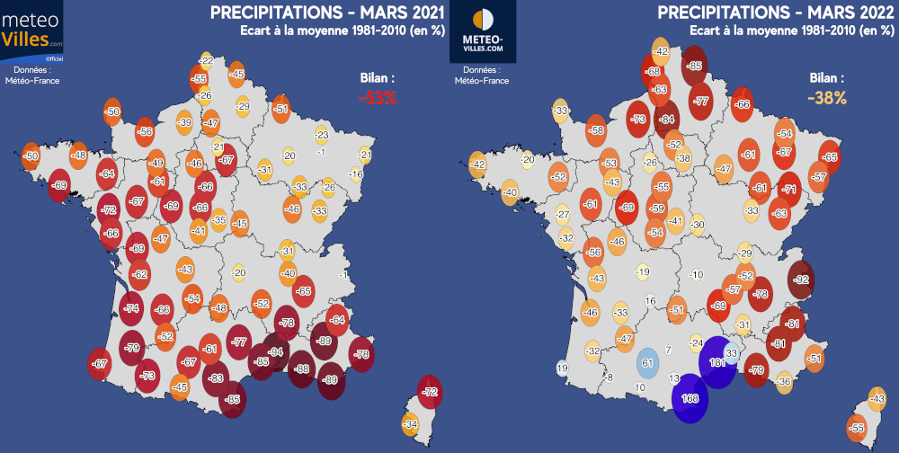 Écart à la normale de la pluviométrie en mars 2021 et mars 2022 - Météo Villes