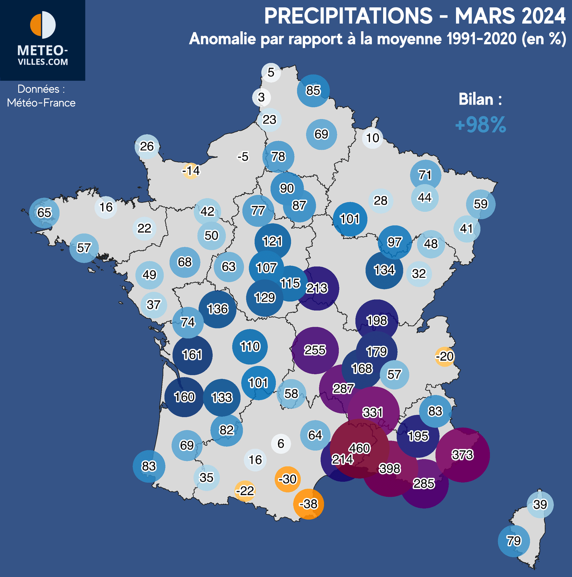 Écart à la normale de la pluviométrie en mars 2024 - Météo Villes