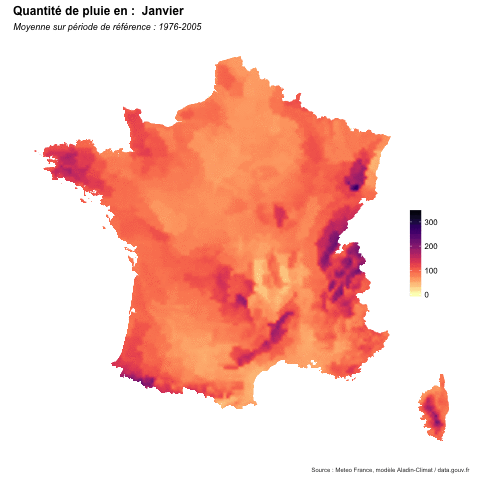 Quantités moyennes de pluie durant les 12 mois de l'année - via Météo France