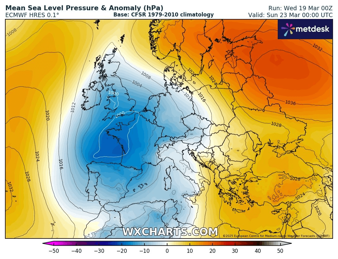 Anomalie de pression pour le dimanche 23 mars 2025 - wxcharts.com