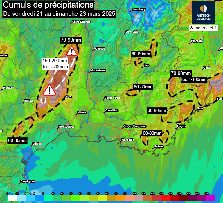 Ces fronts actifs successifs apporteront des cumuls notables, notamment entre les Cévennes et la Côte d'Azur d'ici dimanche matin avec des valeurs pouvant dépasser les 100/150mm d'ici dimanche sur les contreforts cévenols et 70-90mm entre le Var et les Alpes-Maritimes, localement plus si l'orage s'en mêle.
