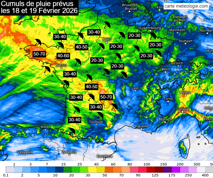 Cumuls de pluie modélisés les mercredi 18 et jeudi 19 février 2026 - meteologix.com