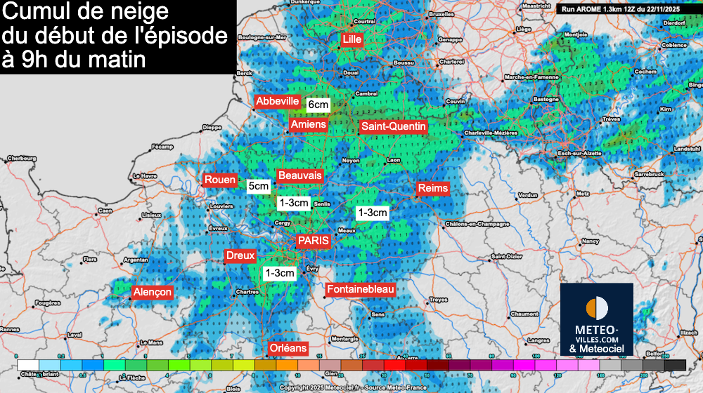 Neige au sol prévue durant l'épisode de la nuit de samedi à dimanche en Île-de-France - selon le modèle arôme