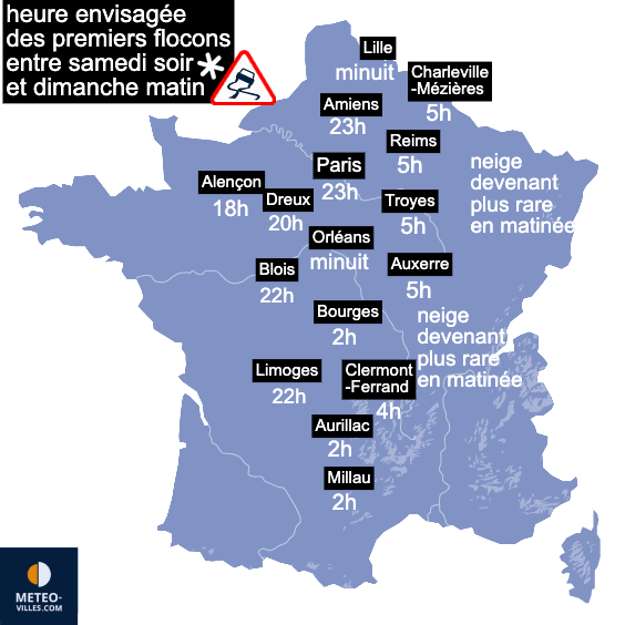 Le département de l’Orne sera probablement la première zone à connaître des chutes de neige samedi en début de soirée. Par la suite, la zone de neige s’étendra progressivement à mesure que les précipitations progresseront dans l’air froid. Entre 20h-22h, des chutes de neige sont prévues entre Dreux, Blois et Limoges. La neige aborde l’Île-de-France et la Picardie par l’Ouest à partir de 21h-22 heures