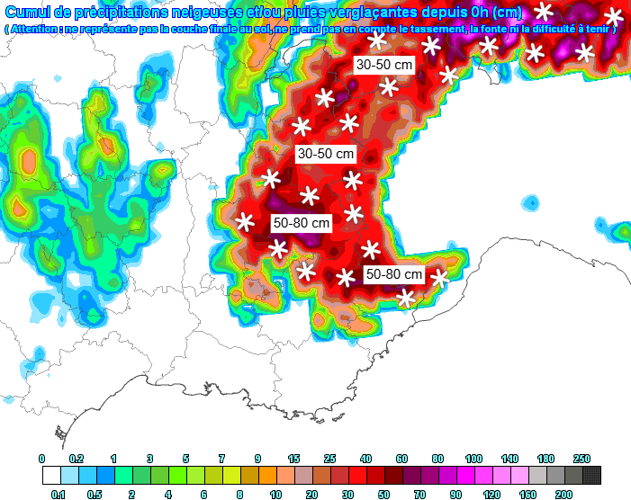 D'ici au milieu de semaine, la limite pluie/neige va s'abaisser nettement, jusqu'à 600 mètres sur les Vosges et le Jura, 1000 mètres dans les Alpes, le Massif Central et les Pyrénées. On peut donc s'attendre à 10 cm sur les sommets des Vosges et du Jura, 5 à 10 cm sur le Massif Central. Les quantités seront plus importantes dans les Pyrénées avec souvent entre 25 et 50 cm, autant que dans les massifs du nord des Alpes. Ce sont toutefois les Alpes du Sud qui vont recevoir le plus de neige avec souvent plus de 50 cm.