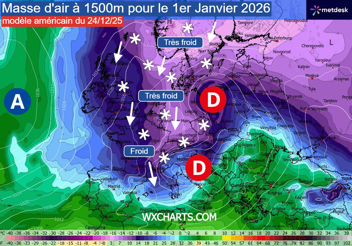Depuis quelques jours, certains scénarios sont très hivernaux pour le passage à la nouvelle année. C'est notamment le cas du modèle américain qui envisage un renforcement de l'anticyclone des Açores jusqu'au Groenland en toute fin d'année 2025, ce qui causerait la plongée d'une dépression sur l'Europe centrale avec un décrochage d'air polaire de la Scandinavie vers la France à l'horizon du 1er janvier 2026. Si cette modélisation se réalisait, la France vivrait un Nouvel An et des premiers jours de 2026 froids et humides avec de fréquentes chutes de neige.