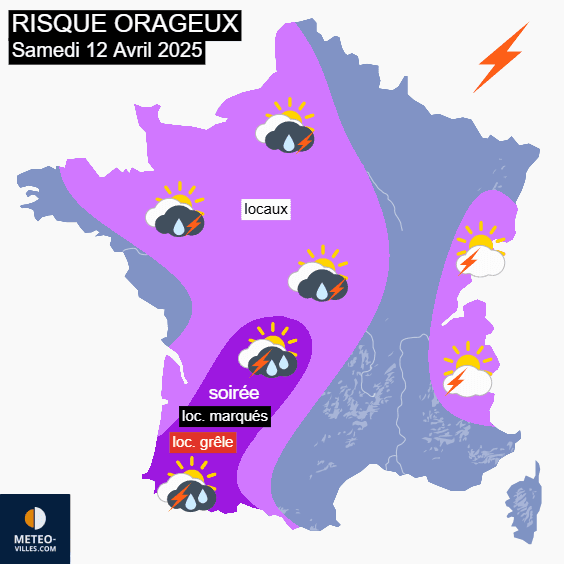 Cartes du risque orageux pour le samedi 12 avril 2025 et la nuit suivante - Météo Villes