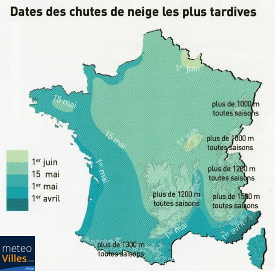 En règle générale, le risque de voir des flocons s'efface dès l'arrivée du mois d'avril sur la côte d'Azur. Il disparaît à la fin du mois d'avril sur les autres régions méditerranéennes ainsi que de la côte aquitaine à la côte vendéenne. Du sud-ouest aux côtes de la Manche, des flocons peuvent être observés jusqu'à la mi-mai.