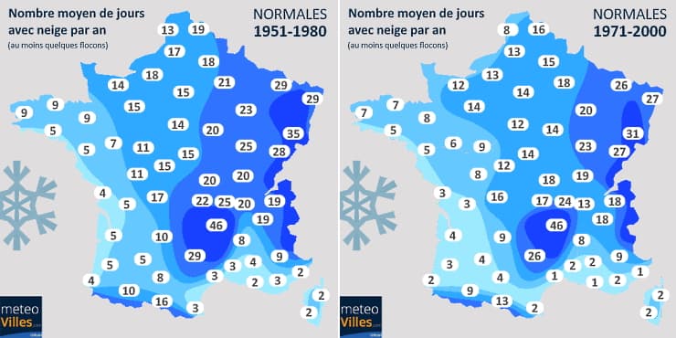 Le nombre moyen de jours de neige recule sur l'ensemble du territoire français même si la baisse est limitée sur les stations situées en altitude. C'est à Lyon que la raréfaction de la neige est la plus prononcée. En seulement 20 ans, le nombre de jours avec neige au cours d'une année y est passé de 20 à 13 ! À Auxerre, il est passé de 20 à 14. La baisse est également nette au sud-ouest avec un chiffre passant de 8 à 4 sur Toulouse.
