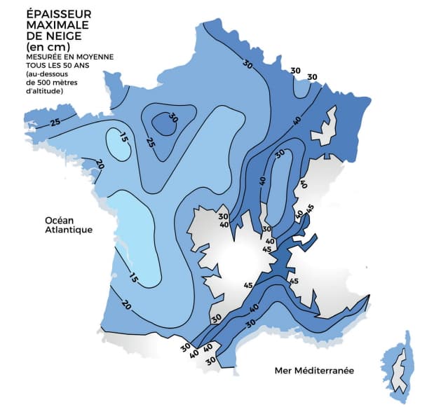 Épaisseur maximale de neige mesurée en moyenne tous les 50 ans - page 62 du livre Météo Extrême