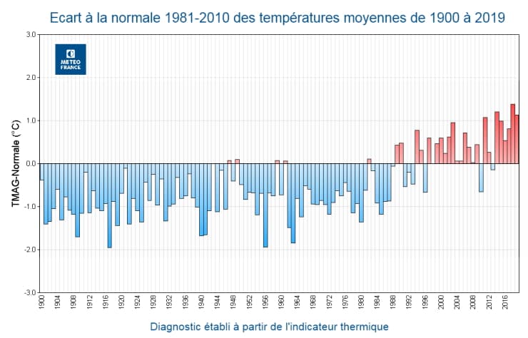 Depuis les années 1990, le réchauffement climatique s'est accéléré en France et dans le monde. Ces dernières années, les anomalies thermiques annuelles sont conséquentes et la tendance à la hausse ne fait que s'accélérer, comme l'illustre le graphique ci-dessus.