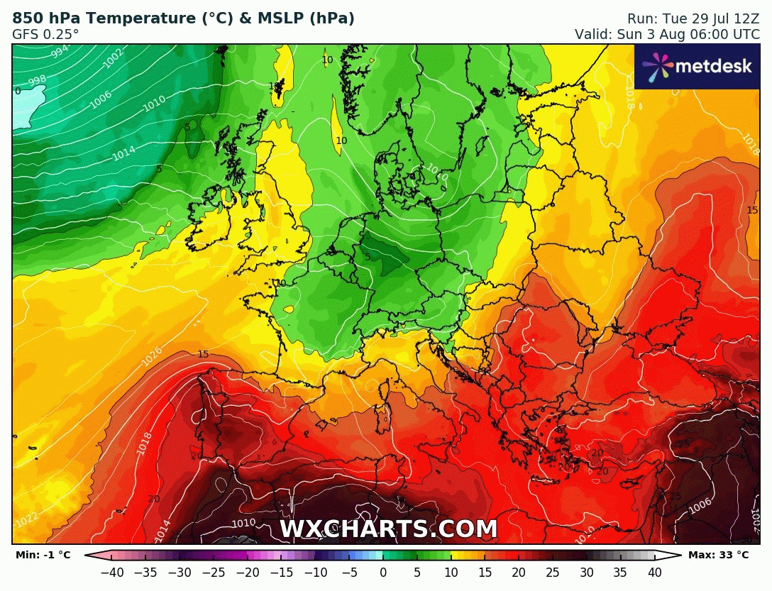 Masse d'air à 850 hPa (vers 1500m) du dimanche 3 au vendredi 8 août 2025 - wxcharts.com