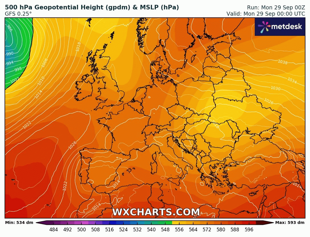 Animation des géopotentiels à 500hPa sur l'Europe du 29 septembre au 3 octobre 2025 – Modèle GFS via WX CHARTS