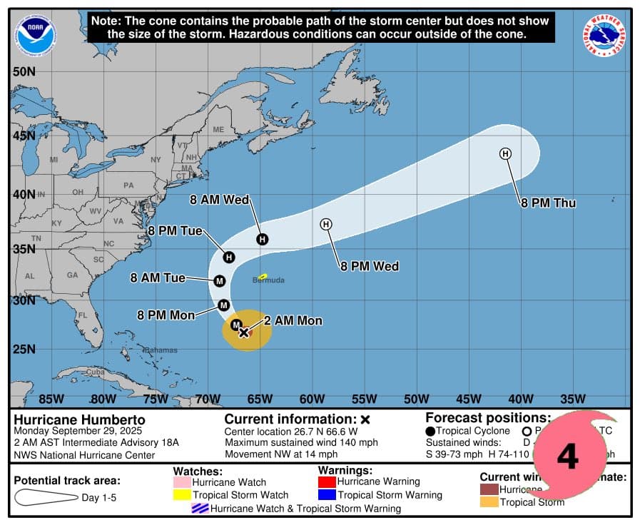Évolution de la trajectoire du cyclone Humberto jusqu'au 2 octobre 2025 – National Hurricane Center