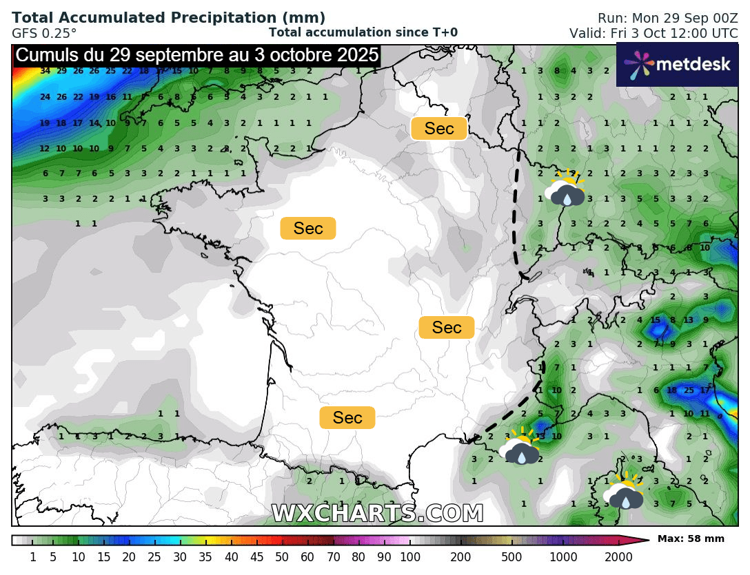 Ainsi, le temps va rester calme et sec sur notre pays dans les prochains jours, en témoignent les cartes des cumuls de précipitations envisagés jusqu'à vendredi 3 octobre avec simplement quelques averses attendues sur l'est du pays, notamment en milieu de semaine entre la Côte d'Azur et la Corse.