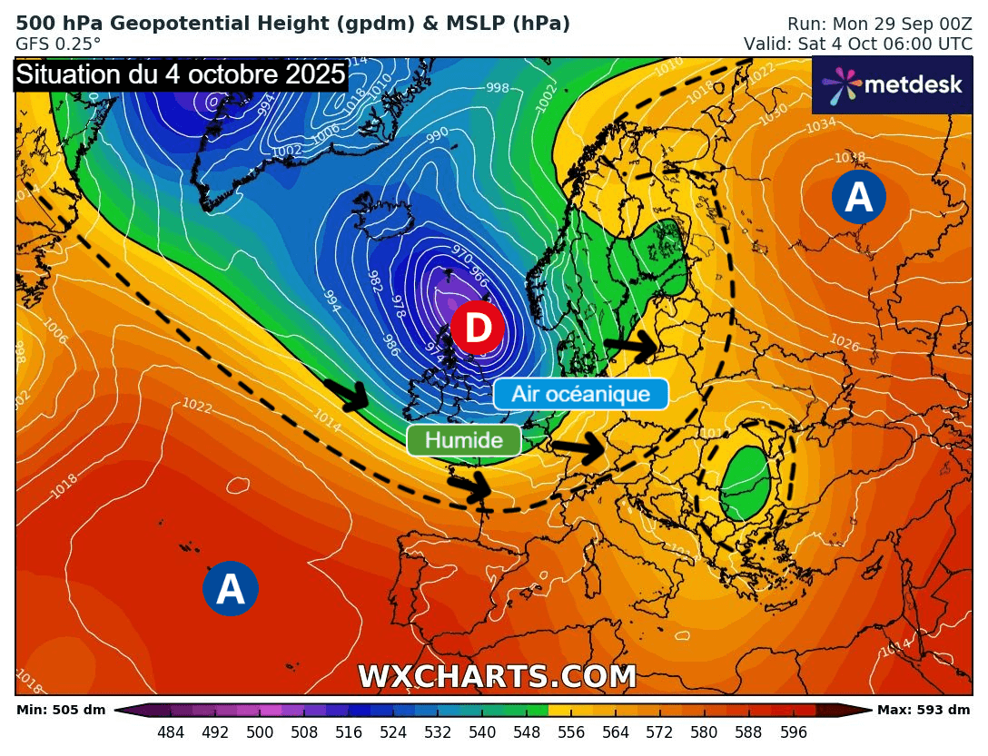 Situation prévue pour le week-end des 4 et 5 octobre 2025 – Modèle GFS via WX CHARTS