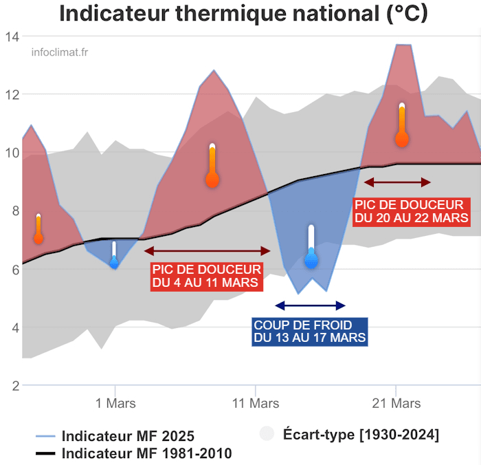 Indicateur thermique national au cours du mois de mars 2025 - infoclimat.fr