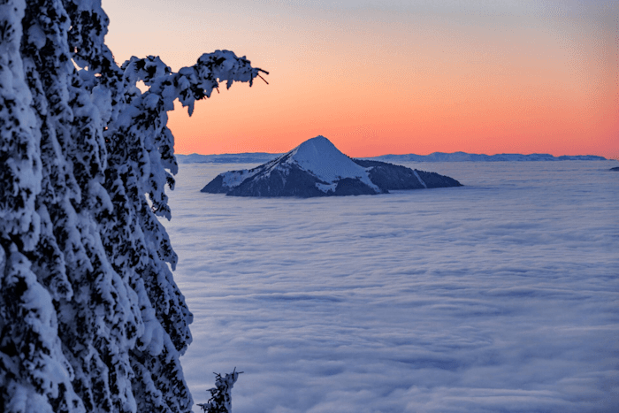 Lorsqu'une mer de nuages se forme, les sommets montagneux passent au dessus d'un "océan de nuages" - via Les Carroz