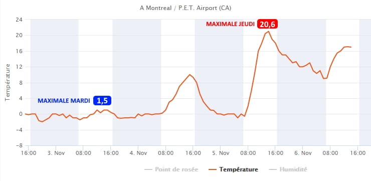 Évolution des températures à Montréal du 3 au 6 novembre 2020 - via infoclimat.fr