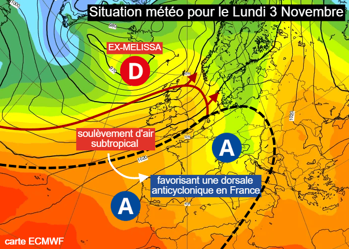La dépression Melissa, qui circulera au sud de l'Islande lundi 3 novembre 2025, aura pour effet de soulever une masse d'air doux subtropical des Açores vers les Îles Britanniques. Cela facilitera le développement d'une dorsale anticyclonique qui s'étendre vers la France dès le début de la semaine prochaine. Après un week-end de la Toussaint humide, il faut donc s'attendre au retour de conditions calmes sur notre pays. Indirectement, l'ex-ouragan Melissa apportera donc une stabilisation des conditions météo en France.