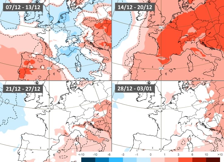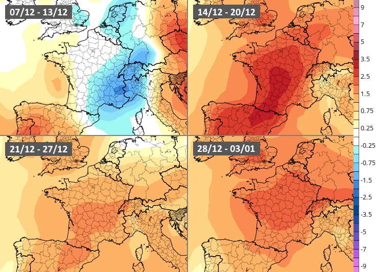 Après une semaine actuelle encore fraîche dans le nord et l'est ainsi que près de la Méditerranée, le modèle européen confirme une tendance sensiblement plus douce pour la semaine prochaine avec une anomalie hebdomadaire qui devrait dépasser les +3°C sur la plupart des régions. En revanche, le modèle ne voit pas de signal de douceur ou de froid pour la fin du mois. Les températures seraient proches des normales durant la période des fêtes.
