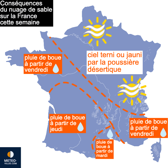 Carte des conséquences du nuage de sable sur la France cette semaine - meteo-villes.com