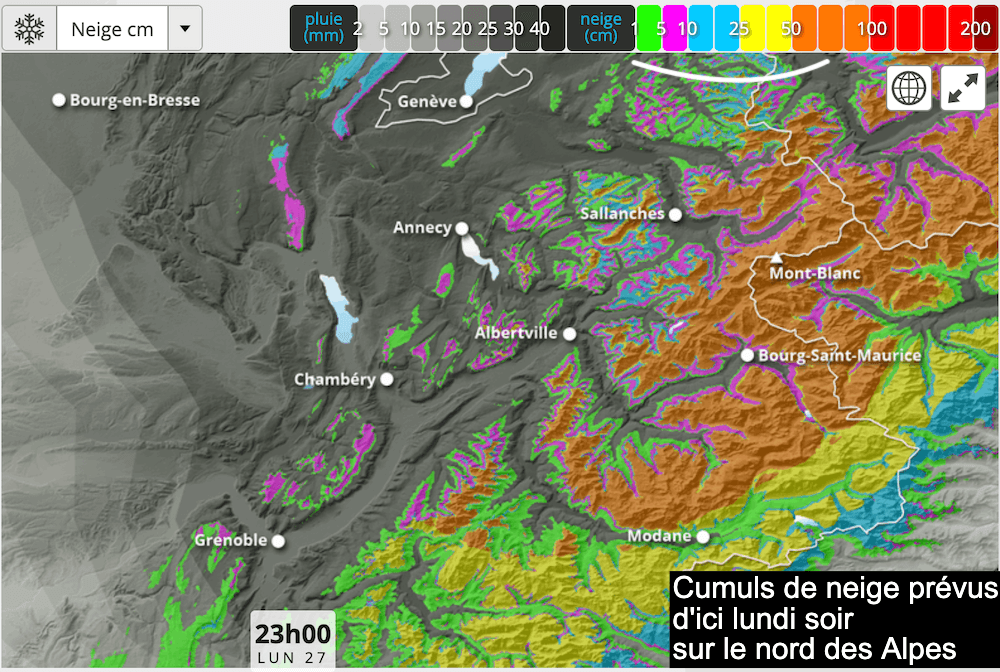 Comme souvent, ce sont donc les massifs savoyards qui seront les plus touchés par les chutes de neige. D'ici au lundi 27 octobre 2025, les altitudes situées au dessus de 1800-2000 mètres vont bien souvent atteindre et dépasser les 50 cm en Haute-Savoie et en Savoie (zones en orange sur la carte).