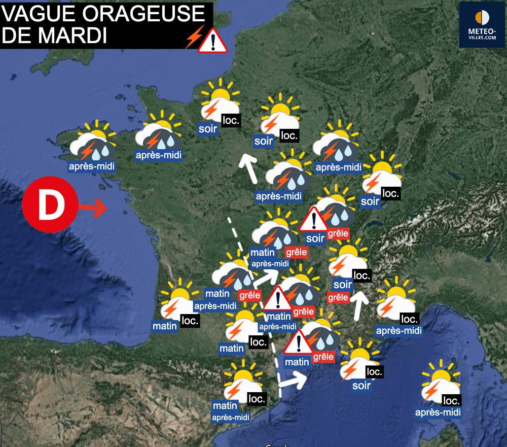 Mardi, les orages apparaîtront d’abord dans le Sud-ouest, puis s’étendront vers l’est et le nord.