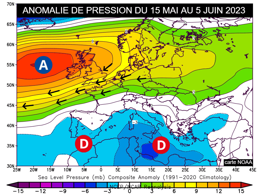 Anomalie de la pression atmosphérique en Europe du 15 mai au 5 juin 2023 - carte NOAA