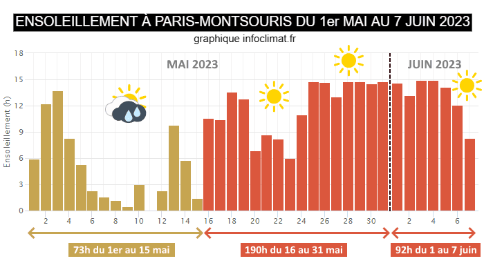 Ensoleillement quotidien à Paris entre 1er mai au 7 juin 2023 - graphique infoclimat.fr