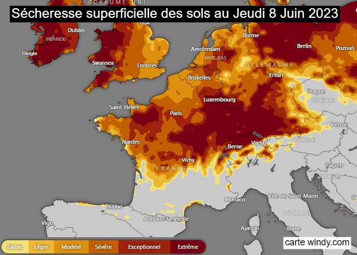 Indice d'humidité des sols en surface au jeudi 8 juin 2023 - carte windy.com