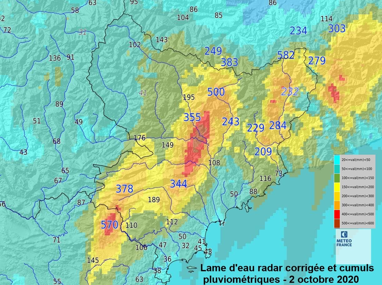 Durant de nombreuses heures et de façon quasi-ininterrompue, des pluies orageuses diluviennes se sont abattues sur les bassins versant de la Vésubie, de la Tinée ainsi que de la Roya, avec des lames d'eau horaires approchant parfois les 100mm. Sur la seule journée du 02 octobre, la barre des 500mm a été franchie : c'est le cas à Saint-Martin-Vésubie (500.2mm) qui détient désormais le nouveau record absolu de pluie en 24h pour le département des Alpes-Maritimes. A noter que ce relevé provient d'une station du réseau EDF, la station parallèle de Météo-France ayant été emportée par la Vésubie, cours d'eau circulant sur la commune...