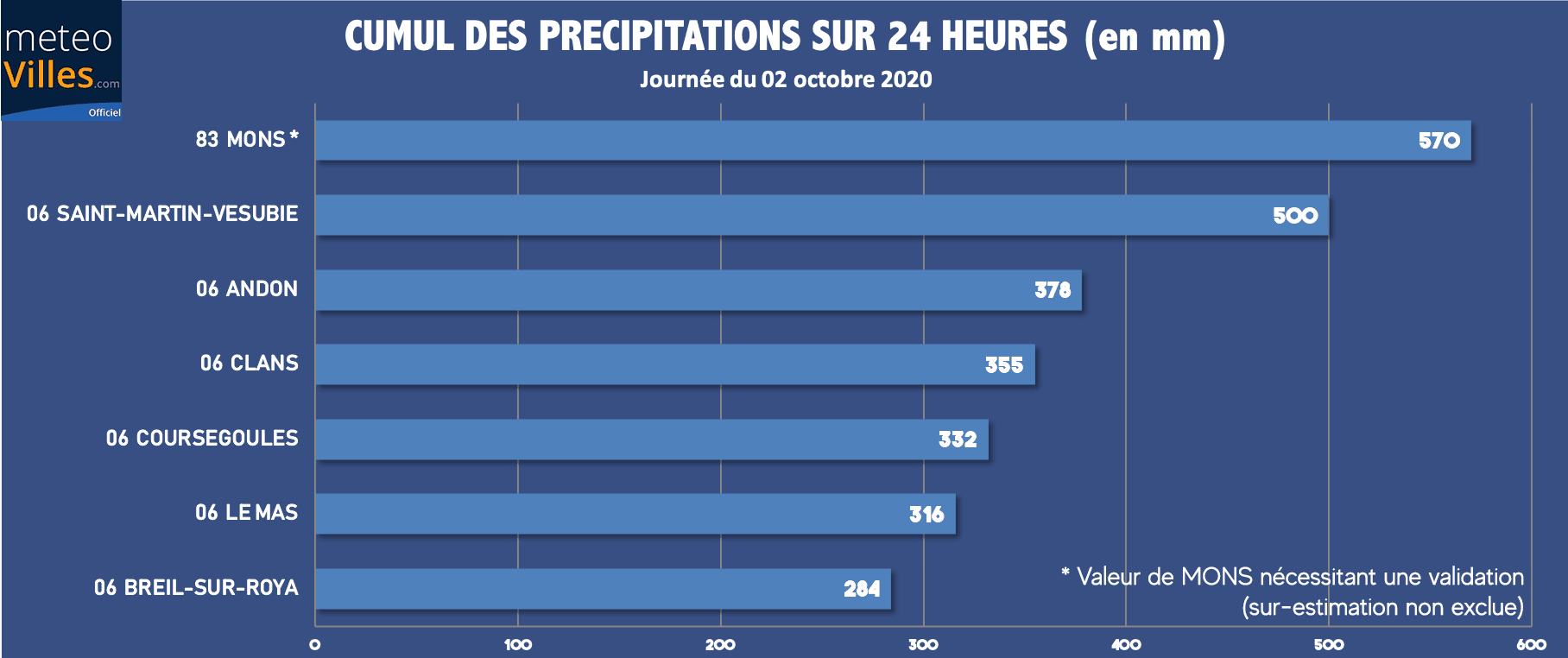 Une lame de 570mm a, en parallèle, été mesurée sur la station de Mons, dans le département du Var. Cette valeur necessite une validation a posteriori (sur-estimation plausible), mais si celle-ci s'avérait exacte, il s'agirait là également d'un record absolu en 24h pour le département du Var.