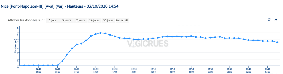 Evolution de la hauteur du Var-aval au Pont Napoleon III de Nice - 02/10/2020 - Vigicrues